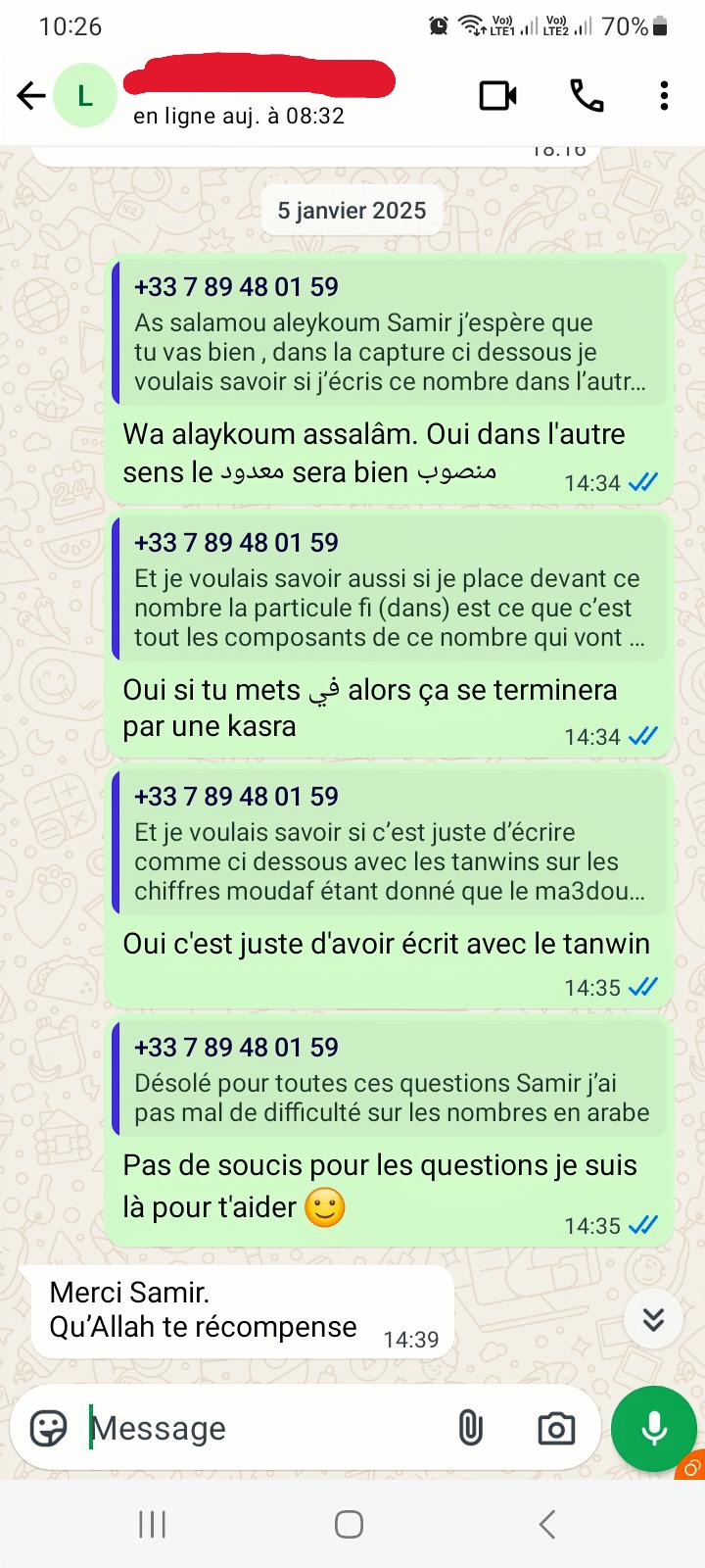 "Les cours sont très bien présentés et bien expliqués. Mon objectif est de pouvoir lire sans les voyelles et comprendre le contenu des textes surtout le coran et en cela tes cours de grammaire et conjugaison m’aident plus.